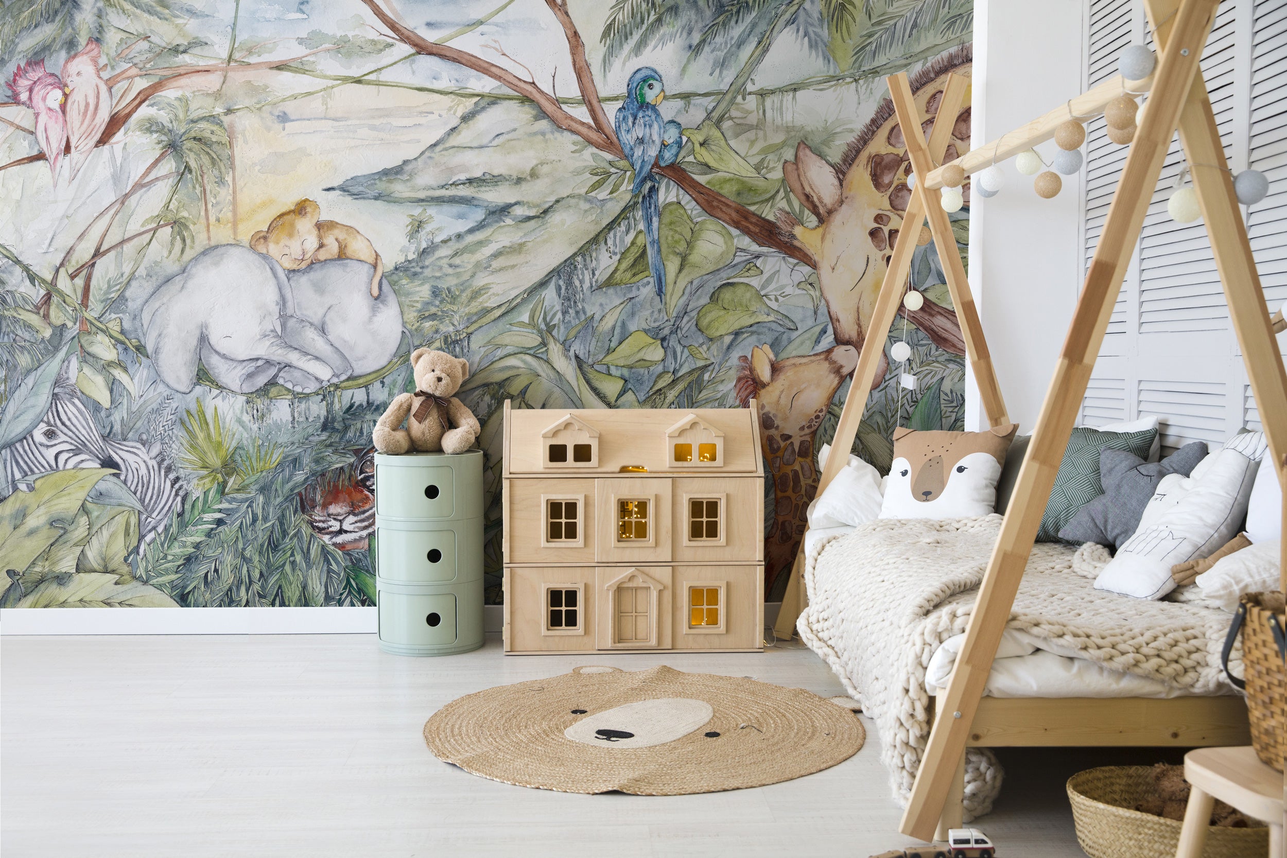 Dżungla w akwarelowym wydaniu, z dzikimi zwierzętami zachwyci najmłodszych oraz rodziców bogatymi detalami, żywymi kolorami oraz wspaniałymi zwierzętami sawanny. Ciepłe, barwne kolory wzoru pozwolą na zaaranżowanie pokoju dla dziecka w każdym kolorze. Idealnie wpasuje się w nowoczesne wnętrze lub urządzone w stylu naturalnym czy boho.