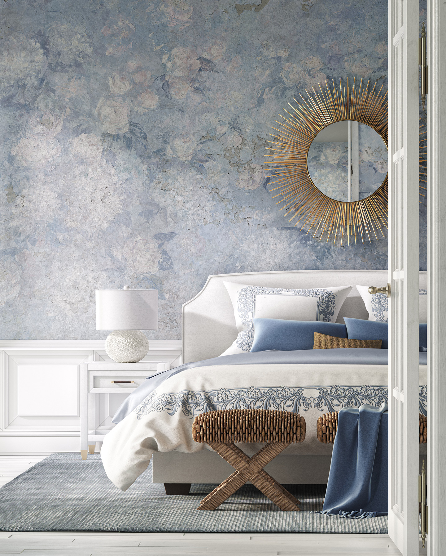 Zanurz się w zmysłowej lekkości natury z tapetą Zephyr od marki Wonderwall – subtelną kompozycją florystyczną, która wnosi do wnętrza spokój, harmonię i eteryczne piękno. Jej pastelowa paleta z przewagą błękitów, bieli i delikatnych różowo-beżowych tonów tworzy malarską mgiełkę pełną romantyzmu i elegancji.