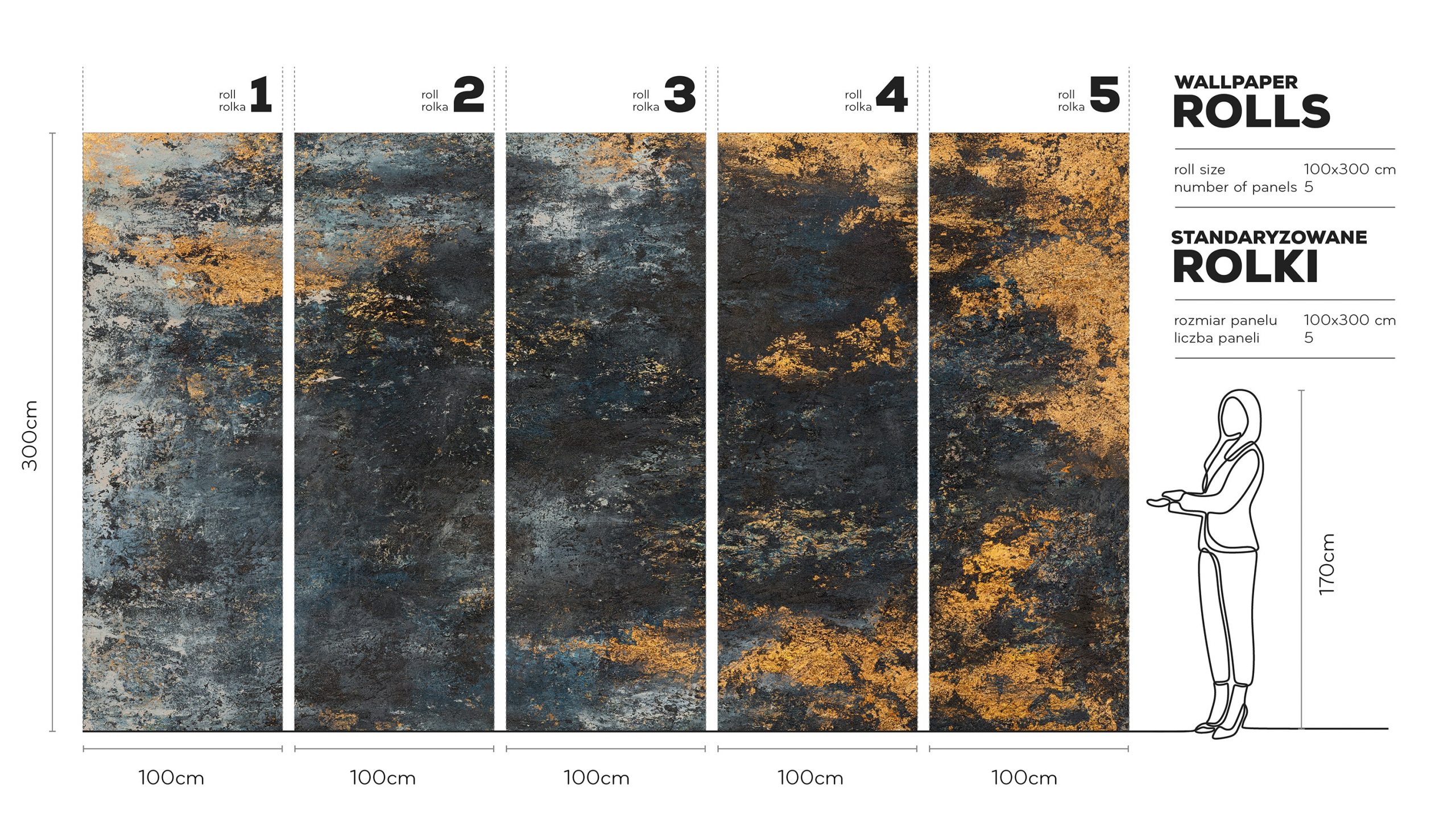 Wyobraź sobie ścianę, gdzie głębokie odcienie grafitu i antracytu łączą się z ciepłymi smugami złota i miedzi. To jak ślady czasu na patynowanym metalu. Vesuvio – Tapeta w standaryzowanych rolkach to niezwykła kompozycja stworzona przez Wiktorię Bugaj. Jej abstrakcyjny i ekspresyjny rysunek przywołuje energię wulkanicznej lawy. Nasycone tony turkusu i granatu dodają głębi. Złote akcenty zaś tworzą świetlisty kontrast, który podnosi temperaturę wnętrza.