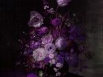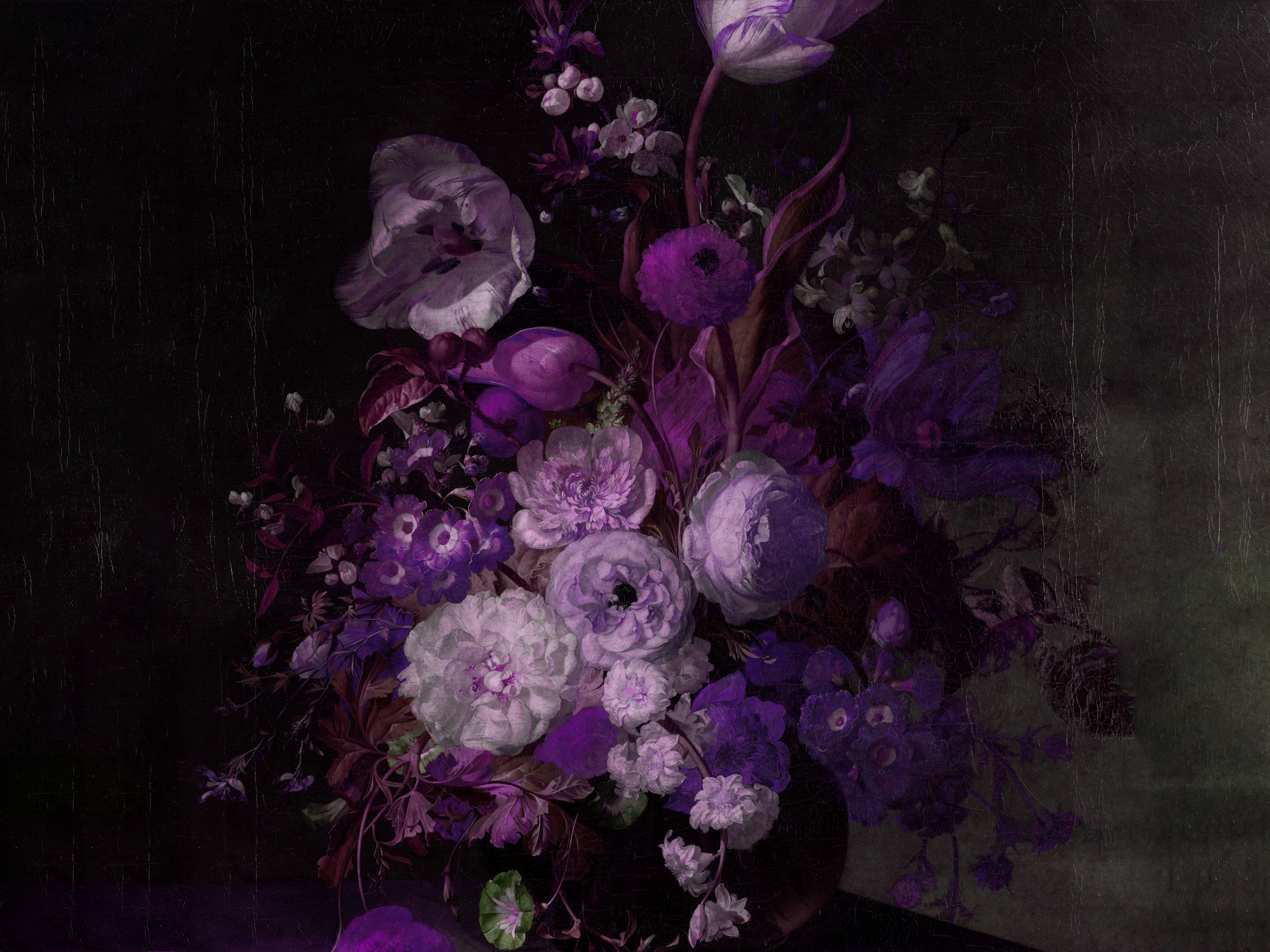 Wyobraź sobie półmrok ogrodu, który rozświetla srebrzysty blask. Violet Dream to mural, który zamienia ścianę w zjawiskową scenę mrocznego romantyzmu. Głęboka paleta fioletów i purpury, wzbogacona lawendą oraz uspokojoną zielenią liści, tworzy kompozycję pełnych, rozkwitających róż, piwonii i ranunkulusów. Z bliska dostrzegasz pociągnięcia pędzla i subtelne spękania craquelure, które nadają obrazowi malarski charakter. Przypomina holenderskie martwe natury, jednak w nowoczesnej, wielkoformatowej odsłonie.