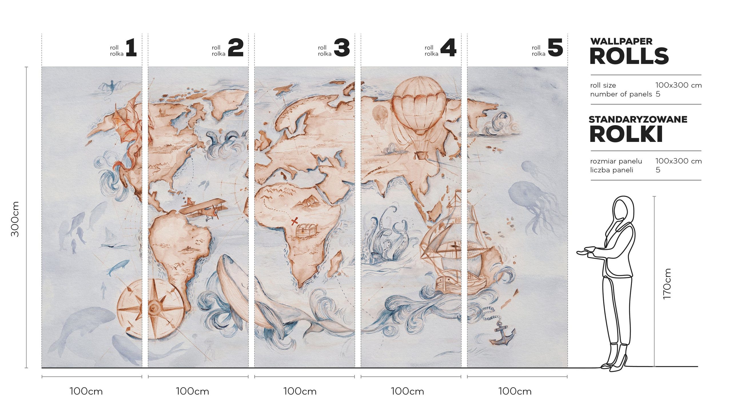 Użytkownicy docenią równowagę między spokojem a opowieścią. Ta tapeta wycisza wnętrze, a jednocześnie pobudza ciekawość. W pokoju dziecka, kąciku do czytania, przedszkolnej świetlicy lub przestrzeni do nauki staje się tłem do opowieści, nauki geografii i odkrywania świata. To dekoracja, która “rośnie” z użytkownikiem: elegancka, ponadczasowa i wyjątkowo fotogeniczna.