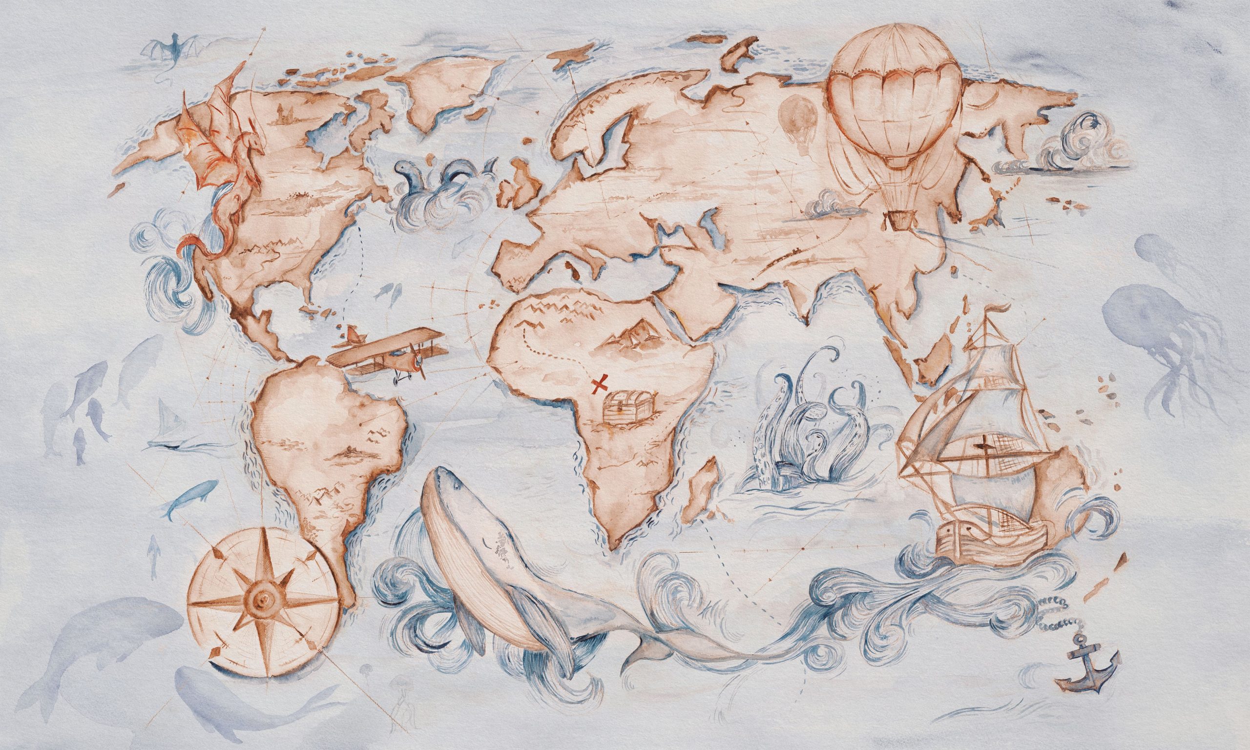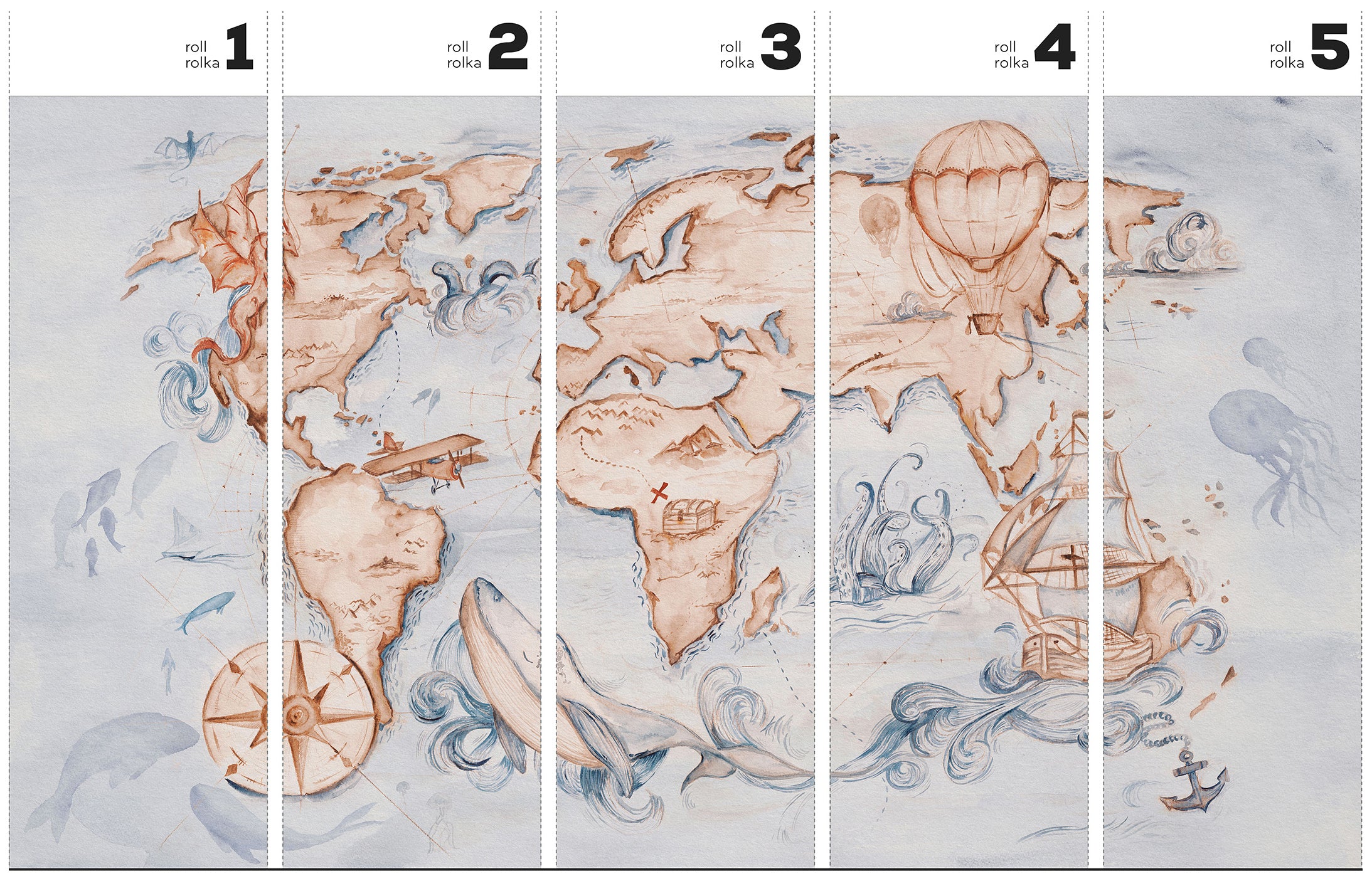 Otwórz drzwi do świata, gdzie stara kartografia spotyka dziecięcą wyobraźnię. Whale Tale – tapeta w standaryzowanych rolkach to wielkoformatowa mapa akwarelowa, która przemienia ścianę w spokojny, marzycielski krajobraz pełen przygód. Miękka, stonowana paleta błękitów i chłodnych szarości łączy się z ciepłymi brązami, terakotą i sepią, tworząc kojące tło w stylu vintage, przypominające lekko wyblakły papier z pokładowego dziennika.