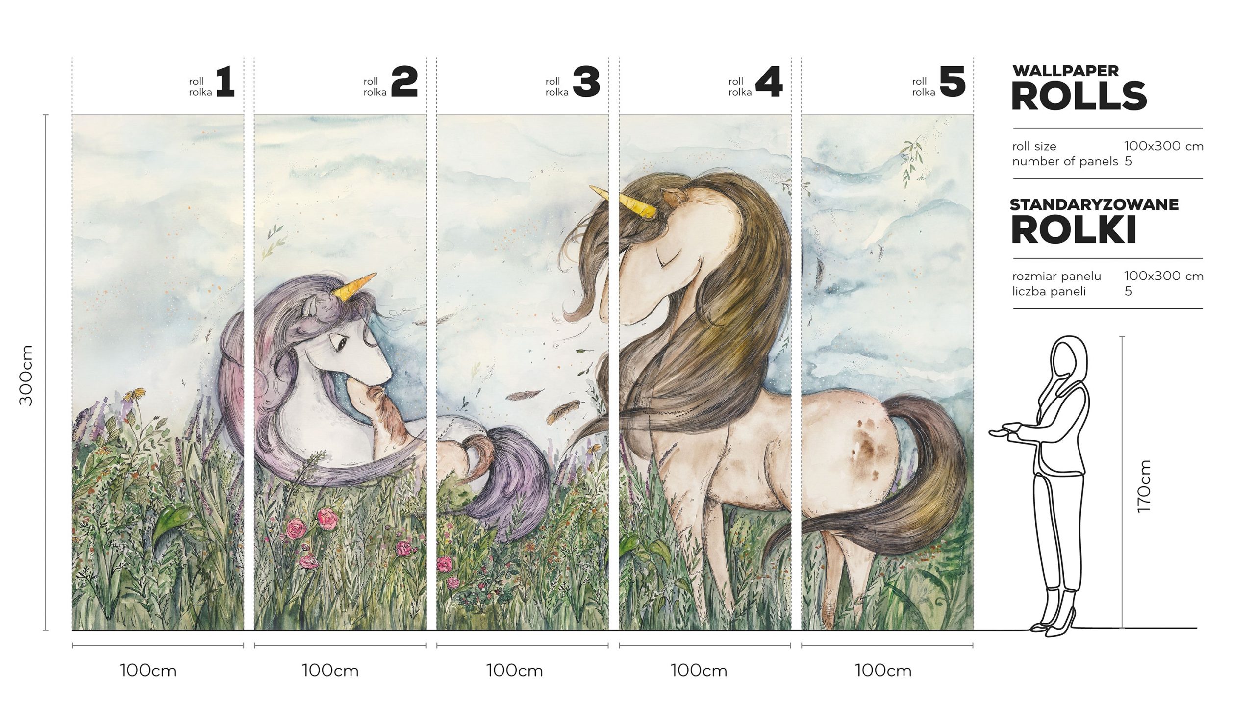 Wild Unicorns – Tapeta w standaryzowanych rolkach wyróżnia się wyrafinowaną kompozycją, subtelną paletą oraz wyjątkową narracyjnością. To dekoracja, która nie tylko zdobi, ale także buduje atmosferę bezpieczeństwa i bliskości. Jeśli marzysz o ścianie, która przemieni przestrzeń w spokojny, magiczny świat, ten mural spełni te oczekiwania z klasą i dbałością o każdy detal. Pozwól, by bajka zamieszkała w Twoim wnętrzu.