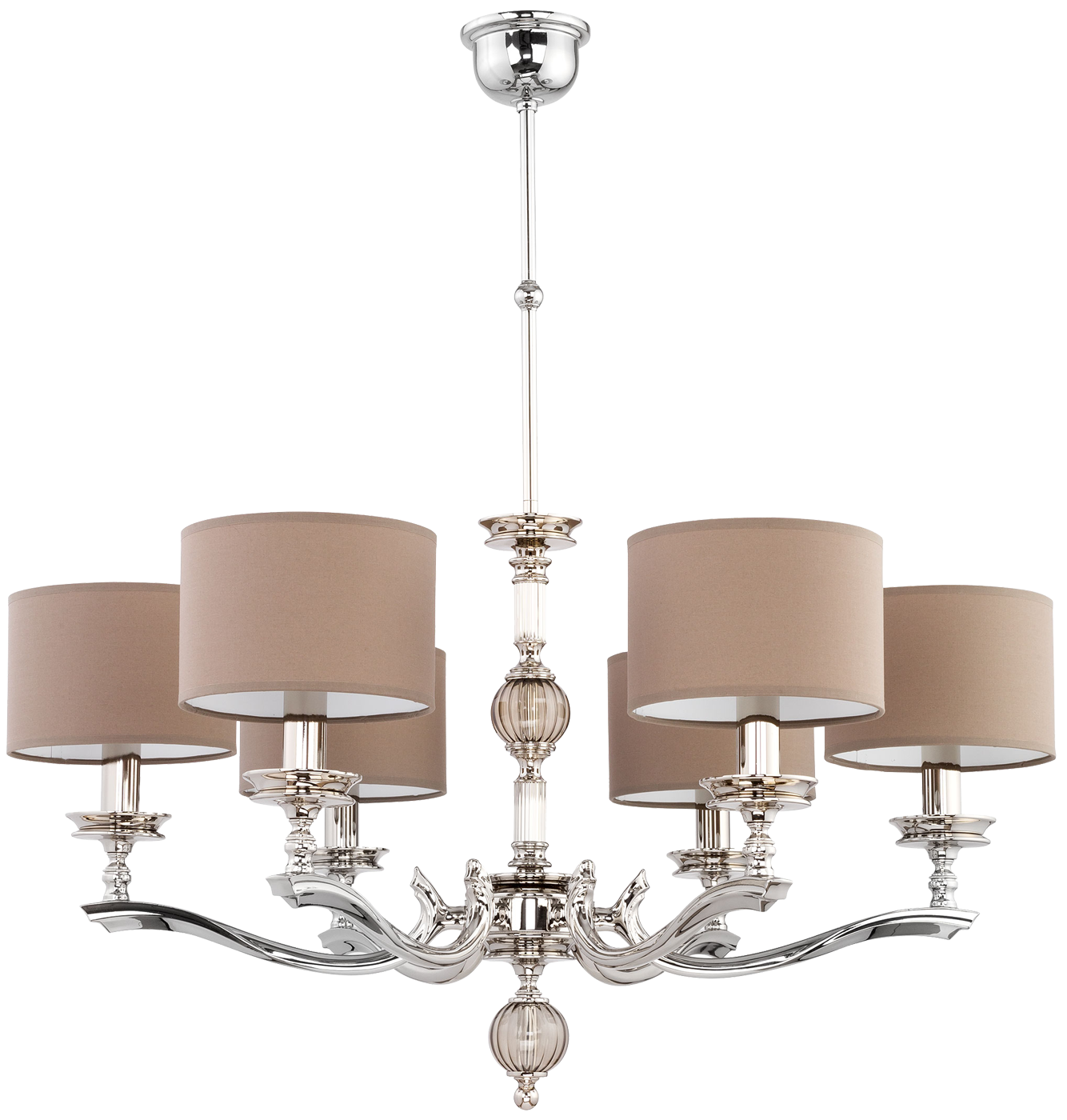 Żyrandol mosiężny z sześcioma ramionami, abażury z tkaniny i szklane detale, niklowane wykończenia. Regulowana wysokość, kompatybilny z LED, duże, eleganckie centrum wnętrza.